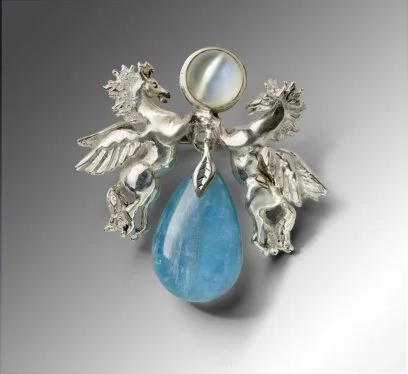 In a very competitive field, I keep wondering what I can do that is very different from other artistic silversmiths. A long-time journalist, I seem to thrive on work that is narrative — that tells a simple story. Such as a placid cat watching a comet streak across a blue lapis sky behind him. Or a man using a rope to rescue a T-Rex from a tarry looking mass of hematite.